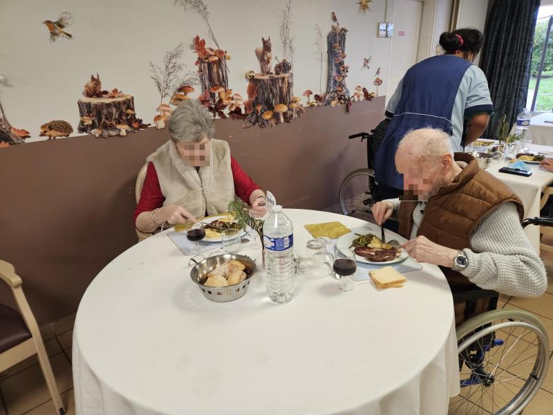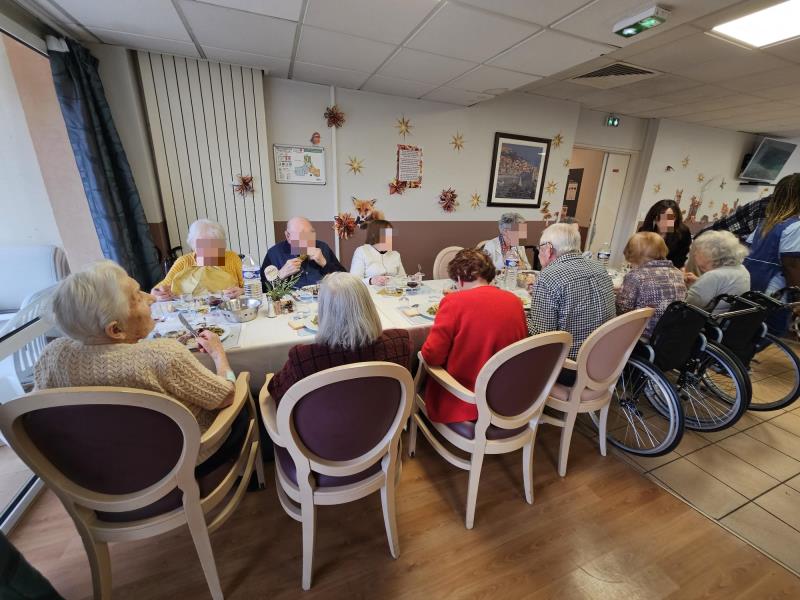 Le menu, soigneusement élaboré par notre chef et son équipe, a ravi tous les convives. De l’entrée raffinée aux desserts gourmands, chaque plat était un savoureux hommage à la gastronomie et à la fête au sein de l'EHPAD. Nos résidents et leurs invités ont unanimement salué la qualité des mets proposés, qui ont fait de ce déjeuner un véritable moment de plaisir et de partage.